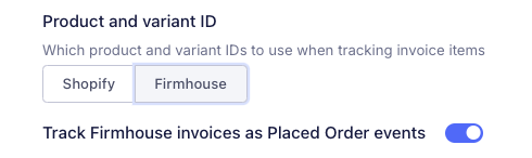 Choose Shopify as your Product and variant ID and make sure Track Firmhouse invoices as Placed Order events is turned off.